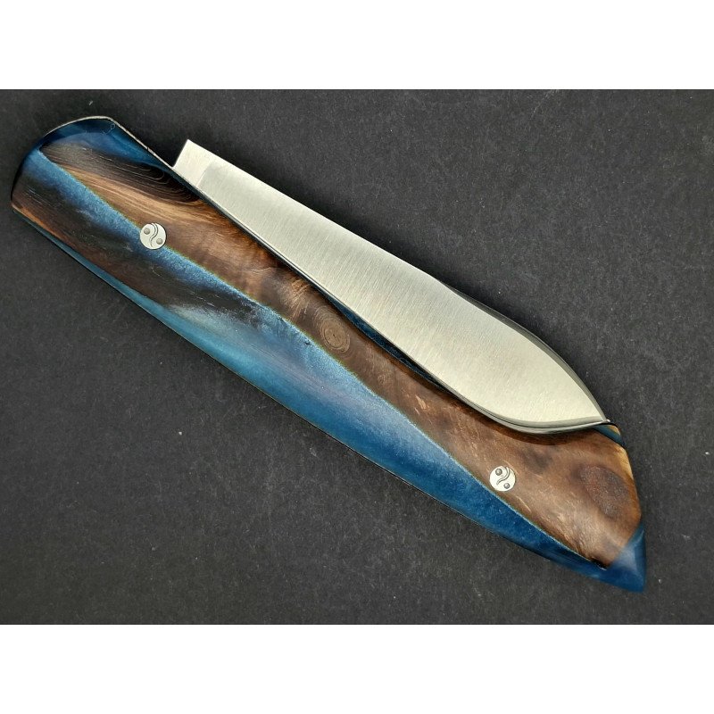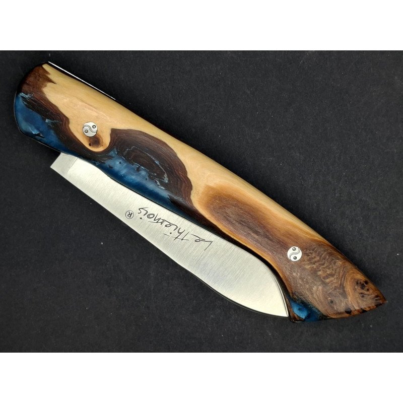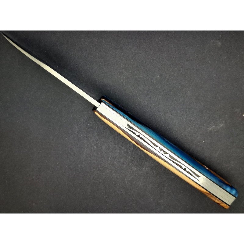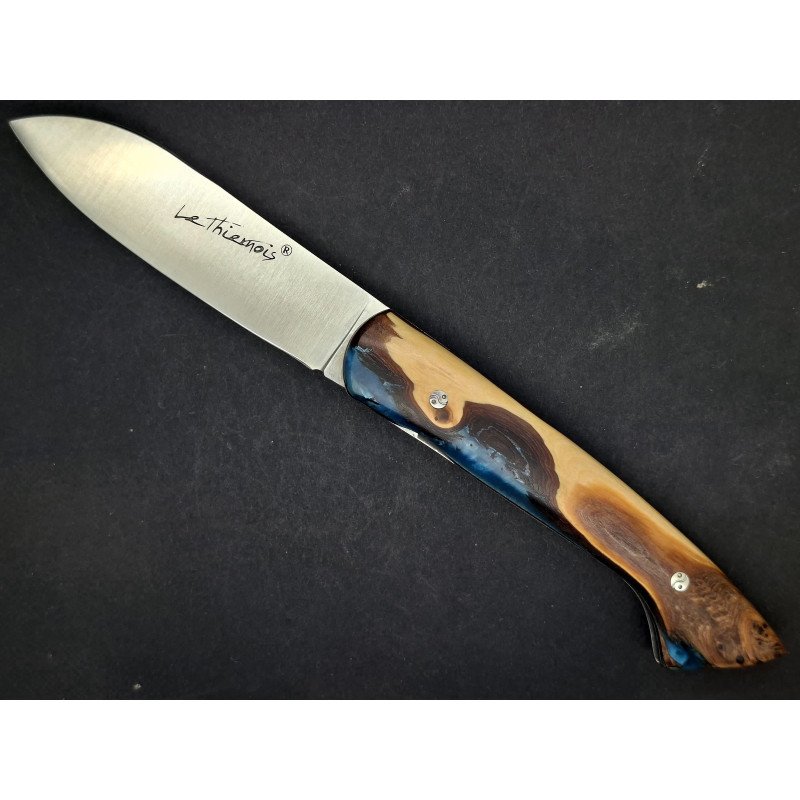 Le Thiernois plein manche. Lame inox 14C28. Patines inox. Ressort ciselé avec butée. Visseries personnalisées. Manche hybride: