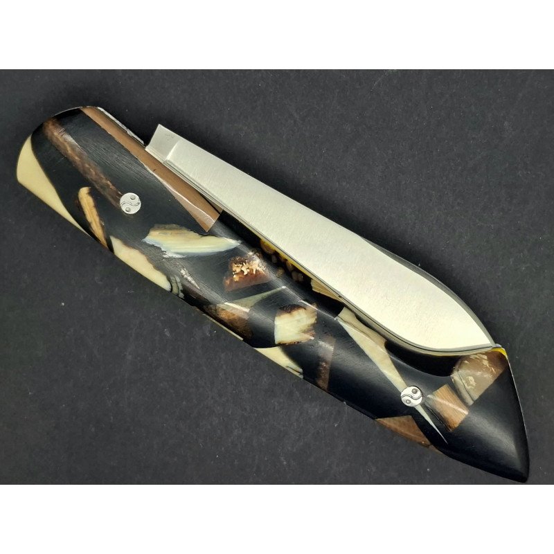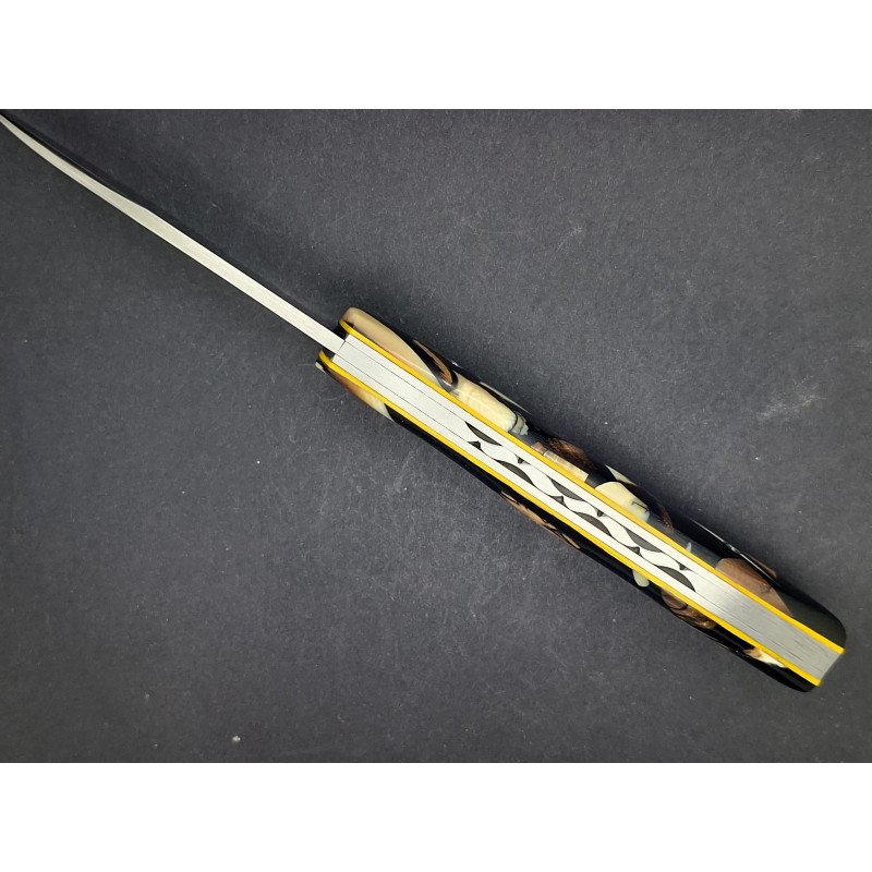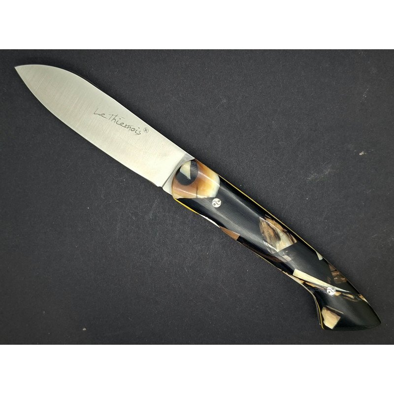 Le Thiernois plein manche. Lame inox 14C28. Platines inox. Ressort ciselé avec butée. Visseries personnalisées. Manche hybride: